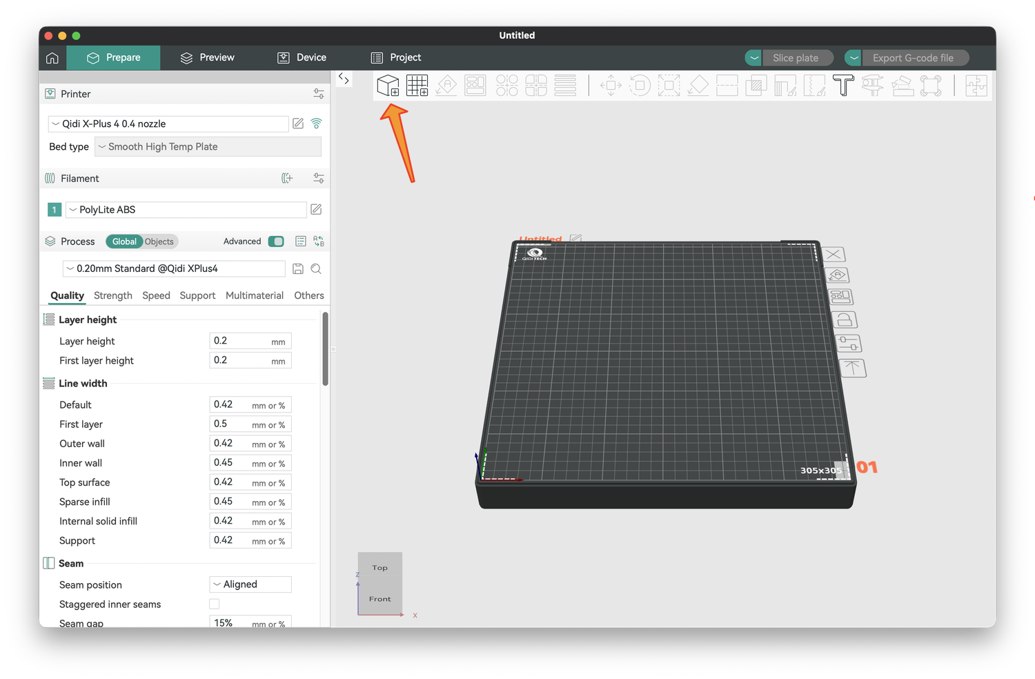 In Orca Slicer, click New Project, which will open a window with settings on the left and a gridded visualization of your printer bed on the right. Because you entered your printer, it knows the geometry of your printer bed. For example, mine correctly displays 305x305 (mm) in the lower right and QIDI Tech in the upper left of the printer bed. The bed is displayed as it would appear as you look into the printer. If you click and drag on the plate, you can reorient it to see it from different angles.