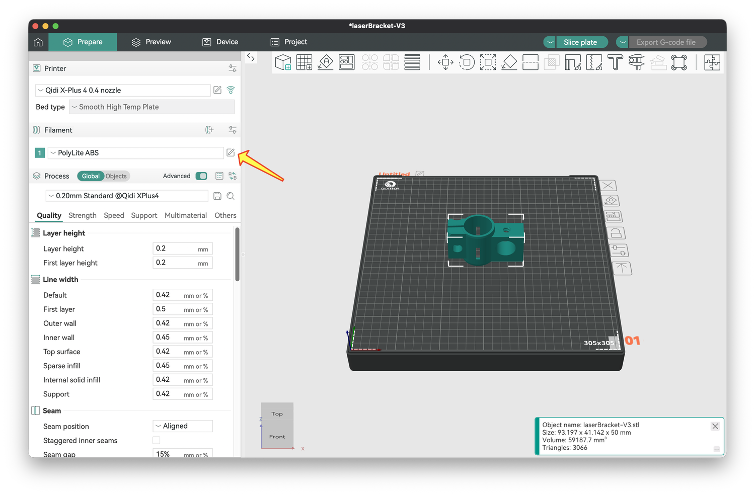 1) I needed to adjust the temperatures of the bed and chamber to be slightly different from the defaults to help with bed adhesion. To do this, click on the pencil in the square just to the right of your filament type (yellow arrow). The settings for bed and chamber temperature are listed under the Filament tab.