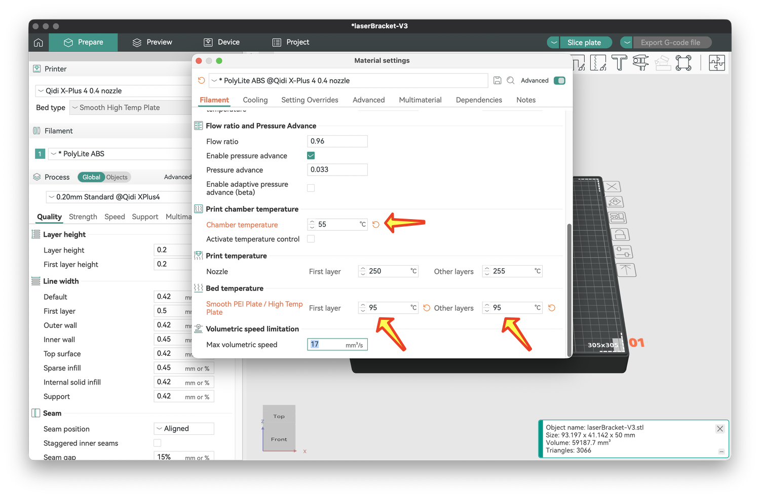 I lowered the chamber temperature to 55°C (as recommended by QIDI) and raised the bed temperature to 95°C throughout the print (arrows below). Note that these modifications are indicated in orange, and you can use the orange circular arrow next to undo these changes. Close the window to save your changes.