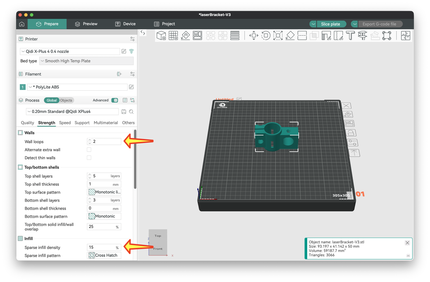 2) I made two modifications to make our prints stronger, and the settings for these are under the Strength tab (arrows below). The first was to double the number of solid plastic wall loops from 2 to 4. The second was to increase the strength inside the object, which is a lattice of plastic and hollow spaces. To give more plastic to the structure, I raised the infill density from 15% to 30%. You could raise this higher, but it will use more filament, and the print times will take longer. You want a balance between these and object strength.