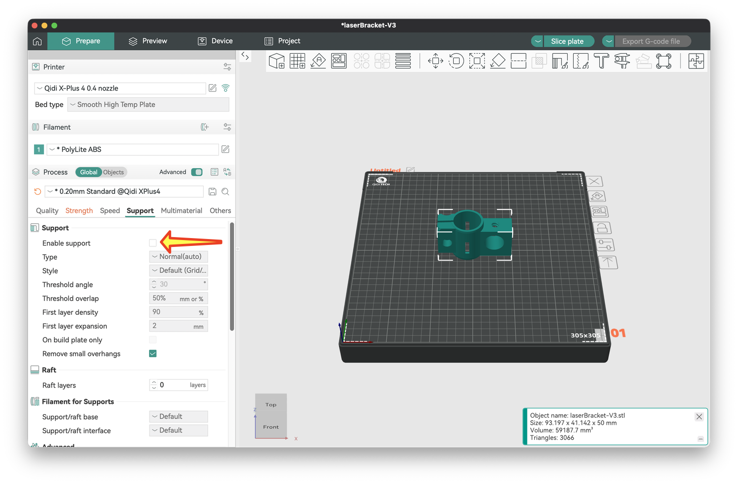 3) Some objects have empty spaces, and it helps to provide support, that is, something in those spaces for the plastic above the space to adhere to. The settings for this are under the Support tab. Check the box next to Enable support (arrow below).