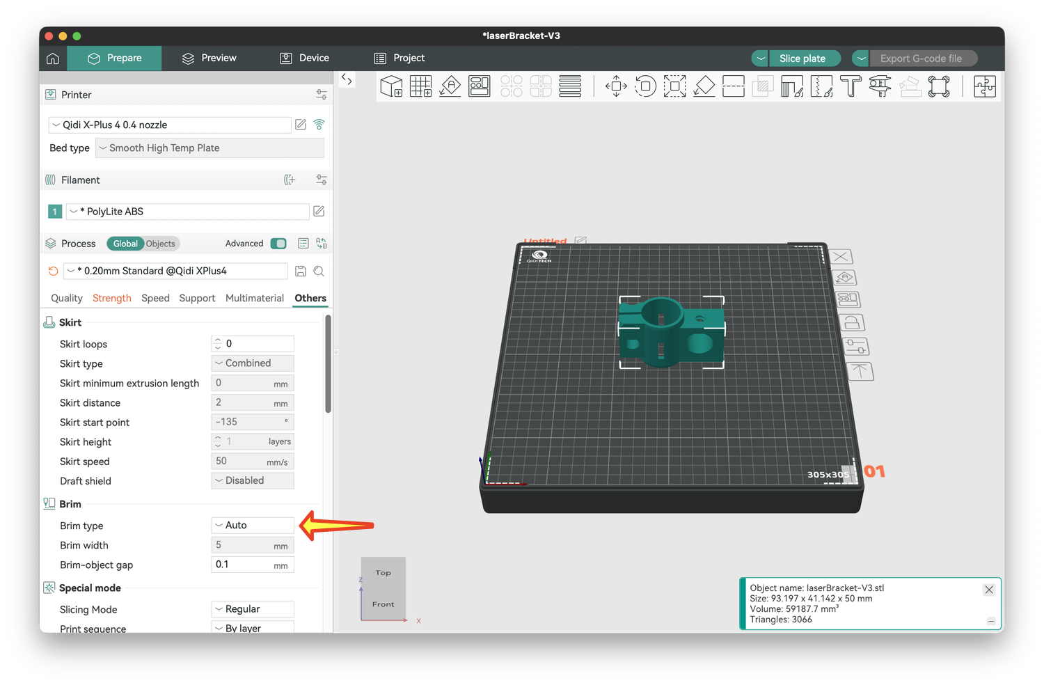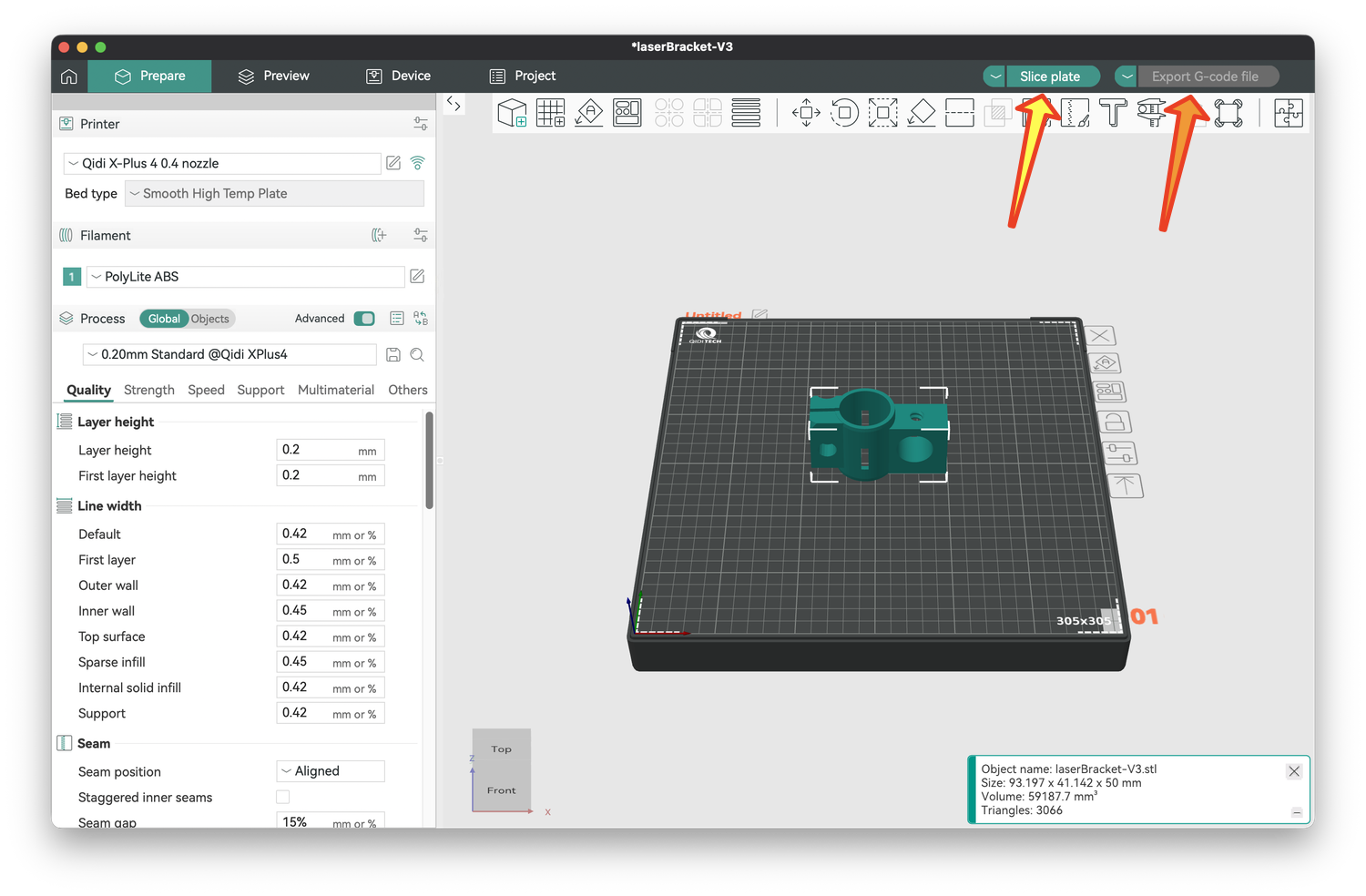 Once these modifications are made, you are ready to slice the model. Click on Slice Plate above the image of your bed and object (yellow arrow). If all goes well, you will not get a warning. If you do, follow the instructions and slice the plate again.