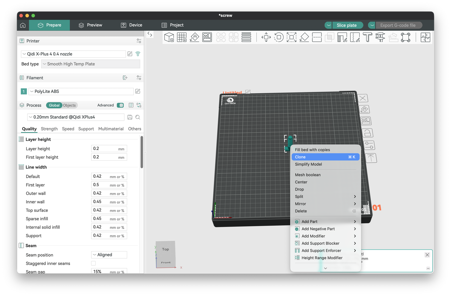 You can also clone an object by right-clicking (control-clicking) on it to bring up a floating menu. Choose Clone, enter the number of additional copies you would like, and they will be added to the printer bed. Sometimes these are placed too close to one another, and you can click and drag to move parts as necessary. You can also rotate a part by clicking on the rotate button above the print bed, which will let you rotate it around three axes: horizontal left-right (x), horizontal towards/away (y), or vertical (z). For example, the screws are added by default standing up (this is the most successful way to print them), but if you wanted them lying down, you could set x to 90°