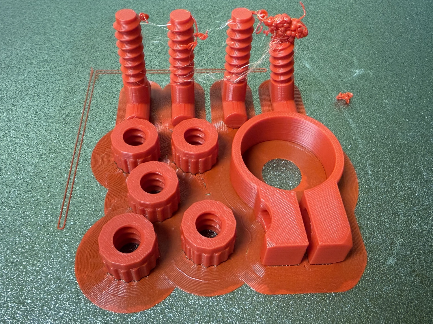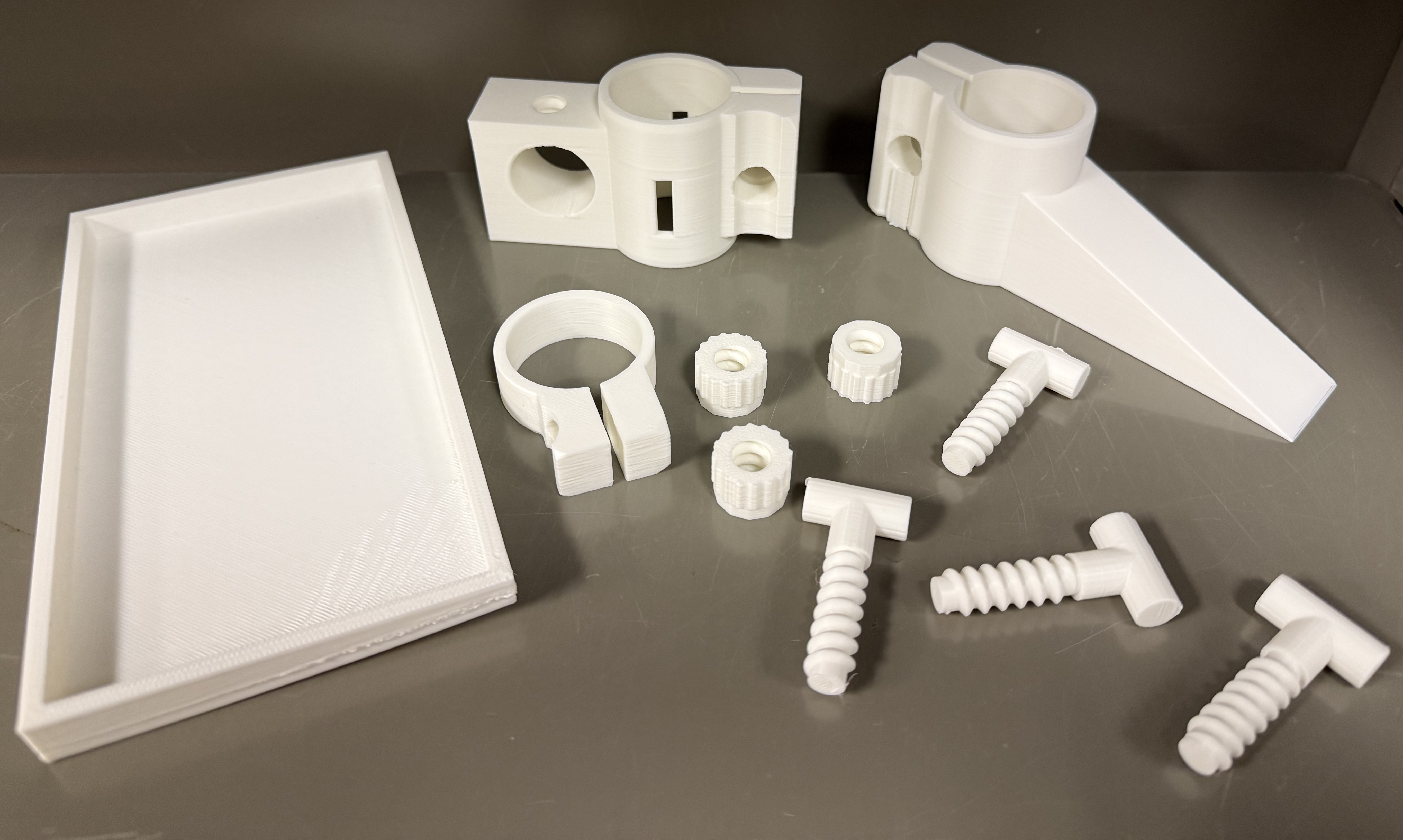 You can print multiple objects at once, and this is useful for small parts. For example, I combine the support collar, four screws, and five nuts (two extras) into a single print. This saves time.