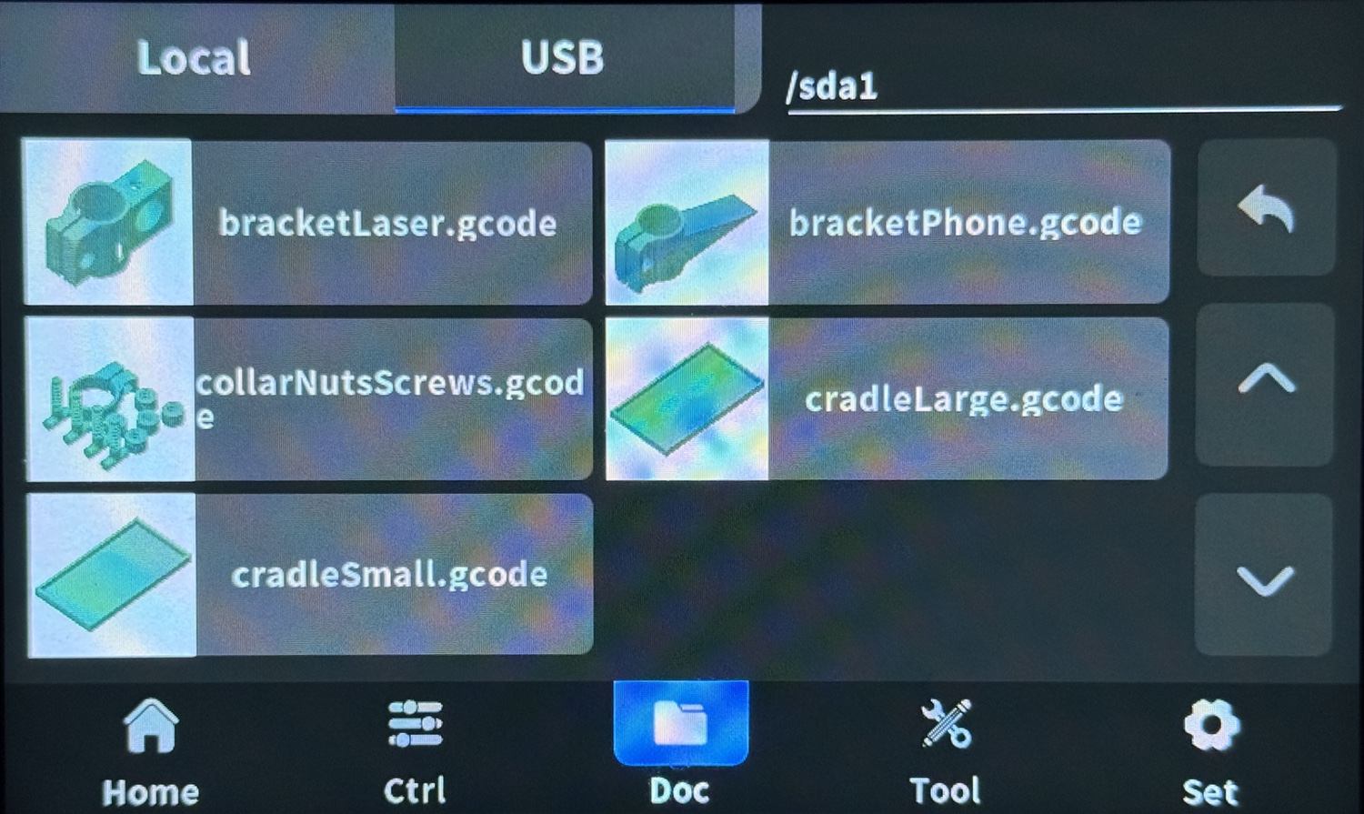 On the touchscreen, select the G-code file from the printer screen; you may have to navigate to your thumb drive, which is on the USB tab below.