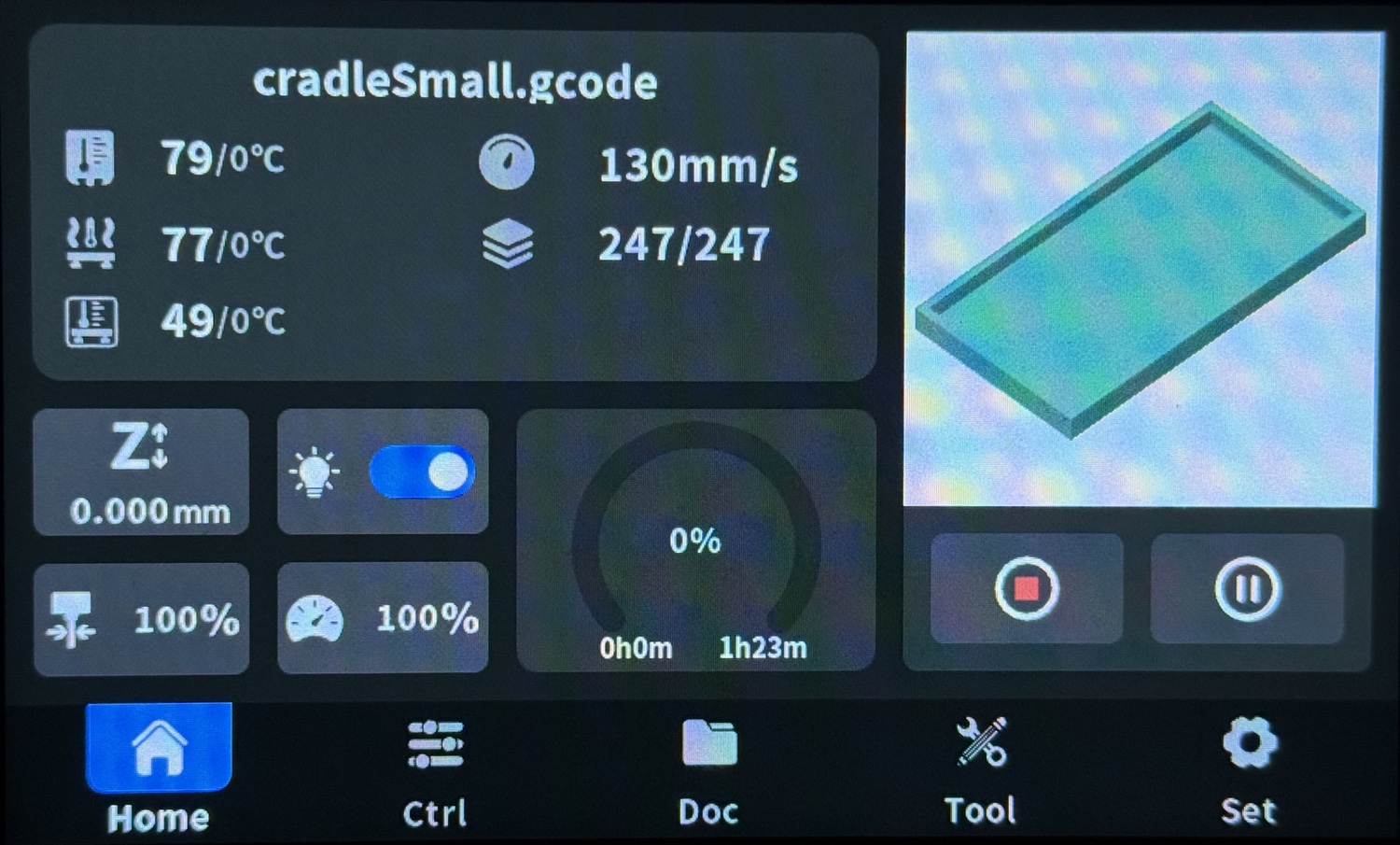 When the print starts, it will display a progress window. Usually, you will let the print run to completion, but if you need to pause or stop it, tap on those buttons. The screen also lets you monitor the temperatures; on the QIDI, these are the extruder, the chamber, and the bed, from the top down. You can also see how much time has elapsed (in minutes and as a percentage), and how much time remains. Most of my Jacob’s Staff prints take about 2 hours.