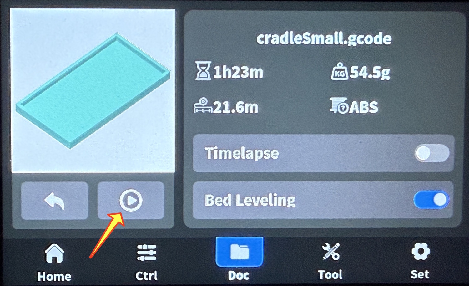Once the file loads, tap on the home screen tab. This shows the estimated time to prepare the print (21.6 minutes), the time to print the object (1 hour, 23 minutes), and the weight of filament that will be used (54.5 grams). Tap the start arrow (yellow arrow) to begin the print. Although it will take more time, leave bed leveling on as it will help make a print successful.