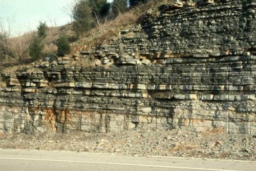 A prominent transgressive surface that is also a subaerial unconformity (sequence boundary) sequence boundary. This surface separates underlying light-colored shallow-subtidal carbonate from overlying darker deep-subtidal carbonate and mudstone. Note the pyritization, visible as a rusty stain, at this surface. This surface has meters of erosional truncation regionally, as well as meteoric cements, and a light carbon isotope spike indicative of a soil. Upper Ordovician Carters Limestone and Hermitage Formation, airport at Nashville, Tennessee. This outcrop has subsequently been removed and is no longer visible.